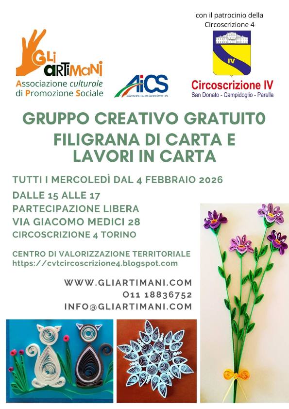 L’Associazione Gli Artimani APS è felice di annunciare l’avvio di un nuovo gruppo creativo di Carta e Quilling , con il patrocinio della Circoscrizione 4, presso la sede del Centro di Valorizzazione Territoriale, in via Giacomo Medici 28, Torino.
